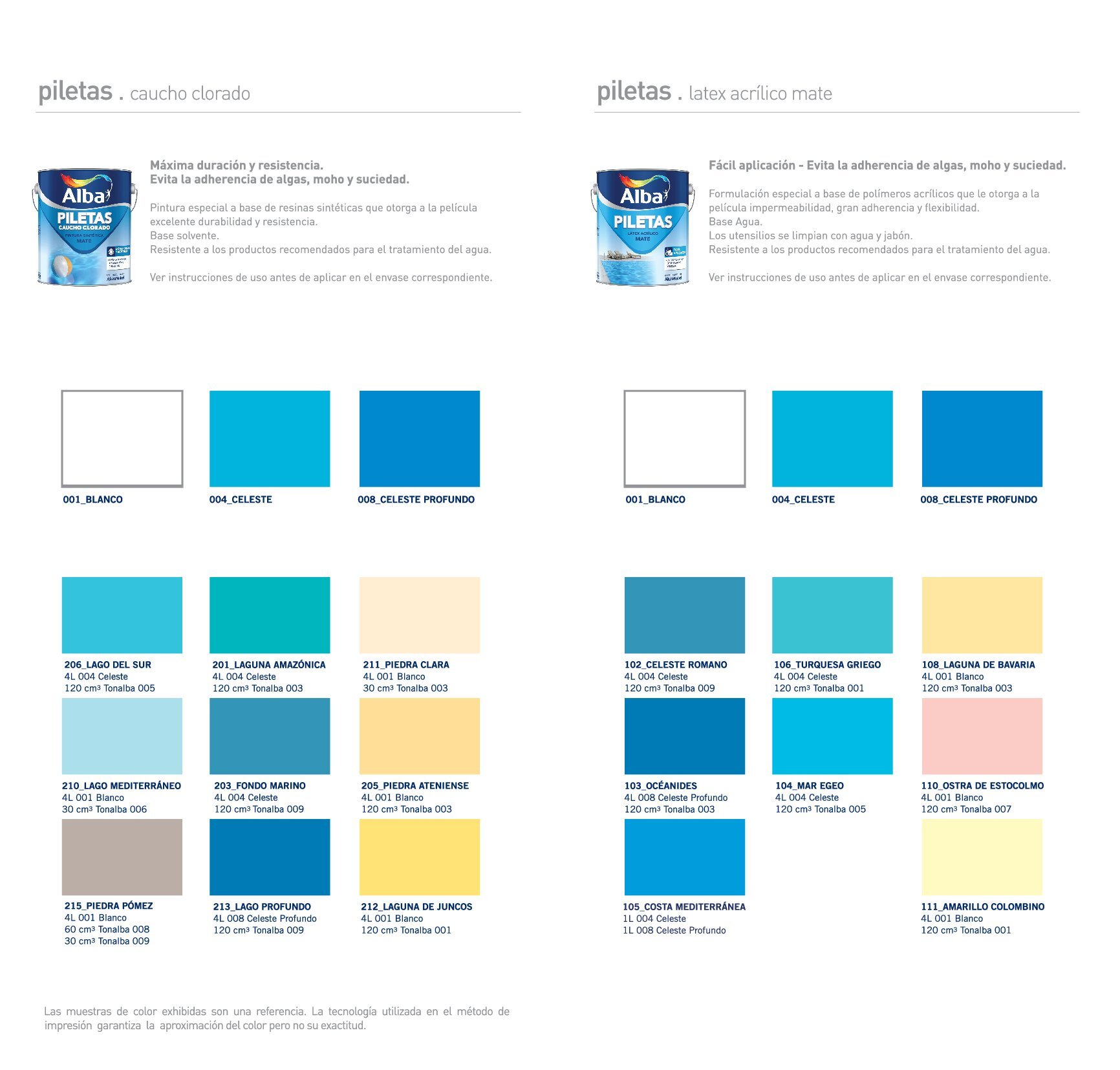 Pintura Sintética Especial para Piletas de Natación Mate. Ideal para la protección y embellecimiento interior y exterior de piletas de natación, de gran resistencia a la intemperie y al uso. Evita la adherencia de algas, hongos, moho y suciedad. Resistente a los productos recomendados para el tratamiento del agua. Blanco y 2 colores listos para usar. Entonable con Tonalba hasta 30 cm3/litro.